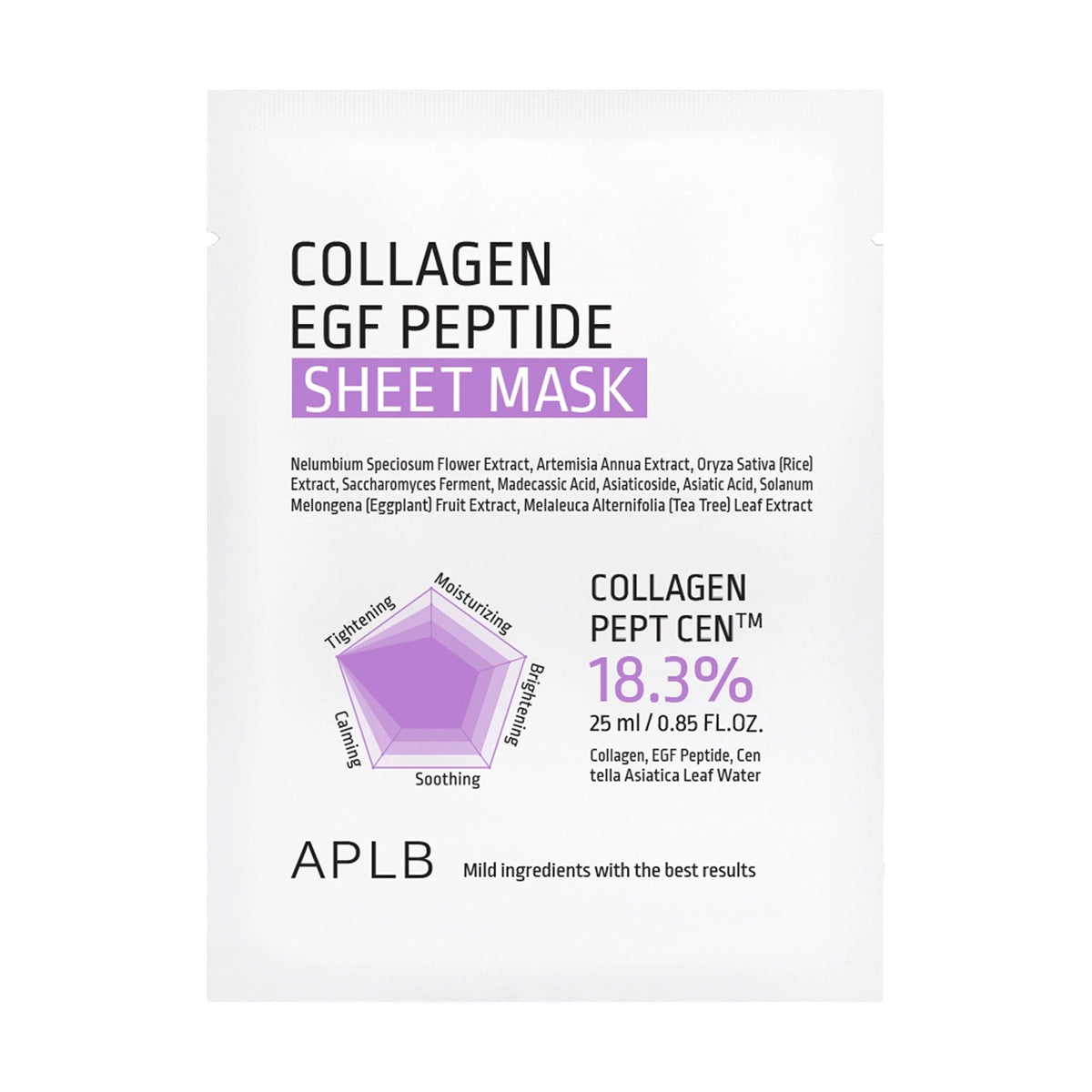 APLB Collagen EGF Peptide Sheet Mask — niisutav kangasmask Collagen Pept Cen™ kompleksiga, EGF-peptiidi ja aasia vesinaba ekstraktiga, mis rahustab, tugevdab ja taastab nahka, andes sellele elastsuse ja sileduse.