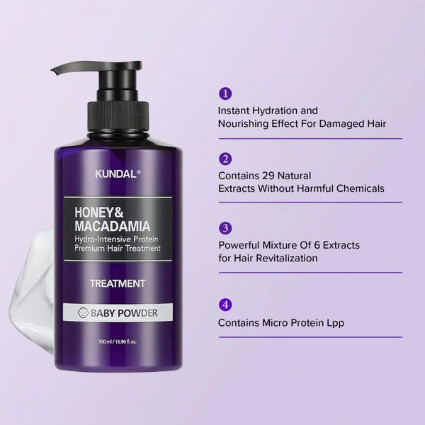 KUNDAL Honey & Macadamia Protein Treatment Baby Powder ühendab mee, makadaamiapähkli õli ja proteiinide jõu, et parandada ja tugevdada kahjustatud juukseid. Mesi niisutab, makadaamiaõli toidab ja tugevdab, samal ajal kui siidiproteiinid ja kollageen aitavad taastada juuste struktuuri. Õrn baby powder aroom lisab hooldusele värske ja puhta tunde.