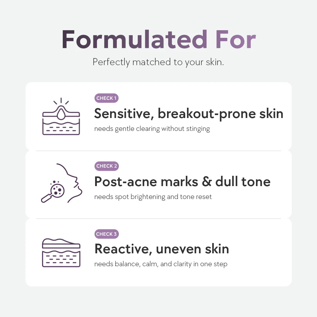 Formula on välja töötatud tundlikule ja probleemsele nahale — mandelhape toimib tänu suuremale molekulile aeglasemalt ja pehmemalt, aidates puhastada poore ja siluda naha mikroreljeefi ilma ärrituseta. Rahustavad ja niisutavad koostisosad, sealhulgas pantenool, alantoiin, sorbitool ja hüaluroonhape, tugevdavad nahabarjääri, vähendavad punetust ning tagavad pikaajalise niisutuse.