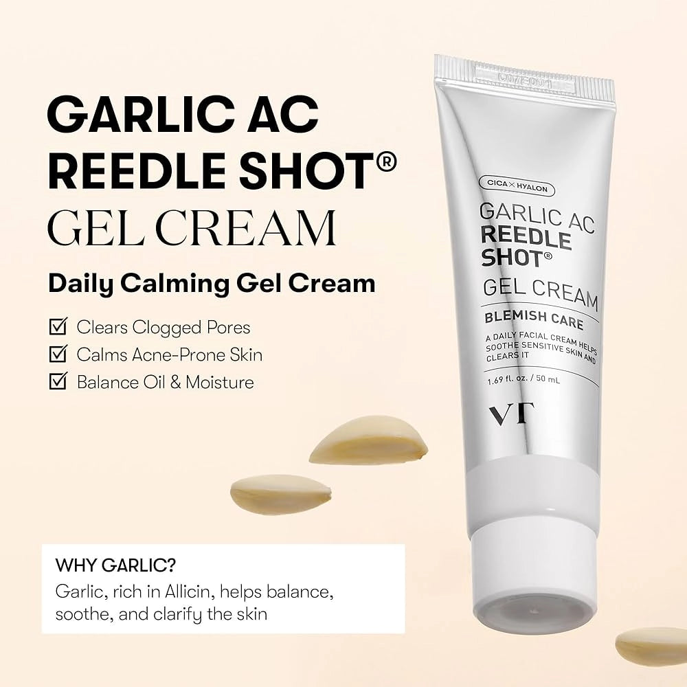 VT Cosmetics Garlic AC Reedle Shot Gel Cream — kerge geelkreem mikronõelte ja küüslaugu ekstraktiga, mis aitab hoida naha tasakaalus, vähendab läiget ja ennetab aknet.