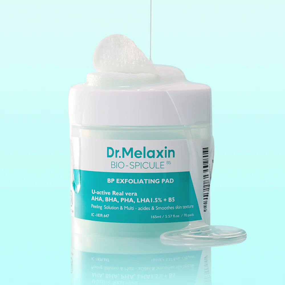 Dr.Melaxin BP Exfoliating Pad — пилинг-пэды с биоспикулами и комплексом кислот 1,5%, которые очищают поры, уменьшают чёрные точки и делают кожу более гладкой.